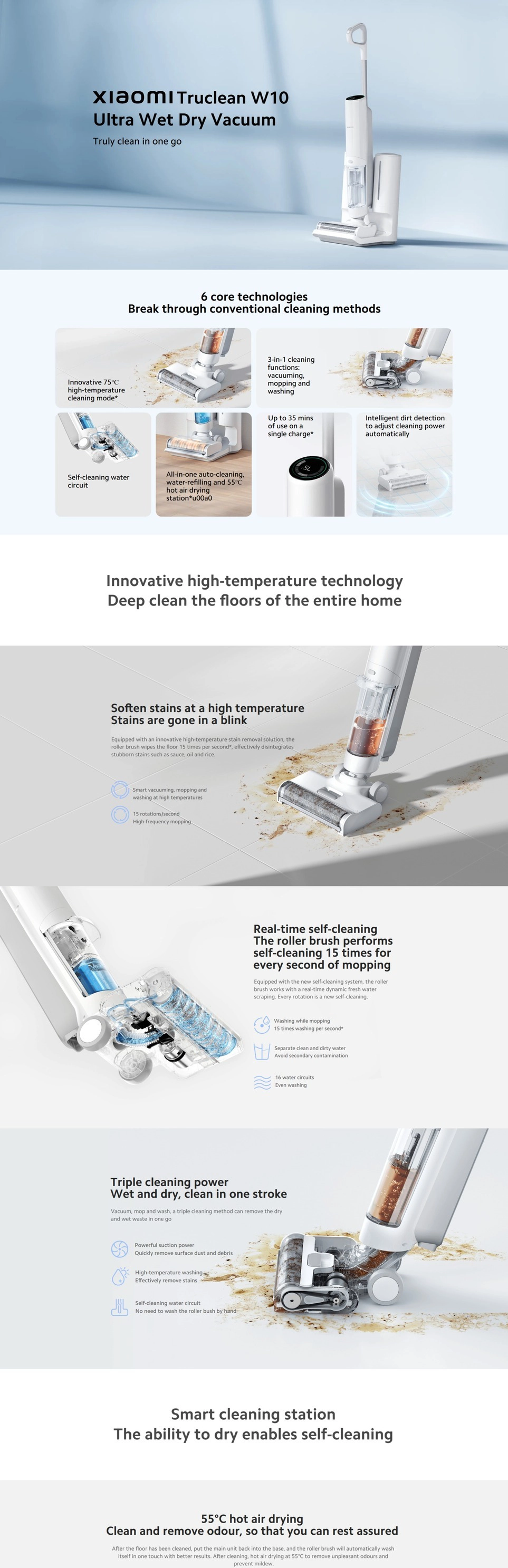 The Xiaomi Truclean W10 Ultra isn't just a floor cleaner, but a complete 3-in-1 cleaning station designed to revolutionize home hygiene. Thanks to its cutting-edge technology, it vacuums, scrubs, and removes the most stubborn dirt in a single pass, using high-temperature water to dissolve stains and grease that traditional systems can't remove.