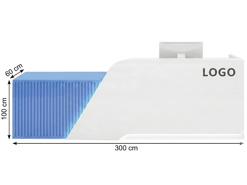 Le dimensioni generose (300 x 60 cm) garantiscono spazio a sufficienza per registratori di cassa, PC, stampanti termiche e tappetini da lavoro, mantenendo tutto organizzato e nascosto alla vista del cliente grazie al pannello frontale alto.