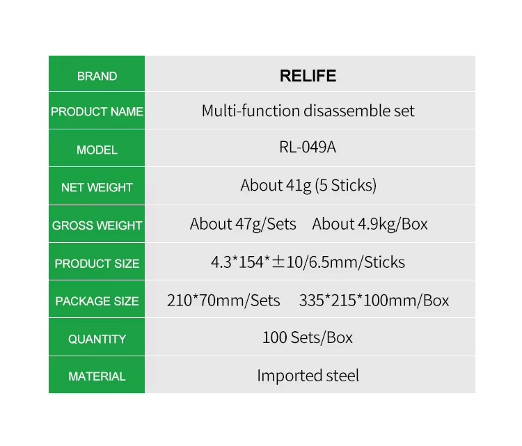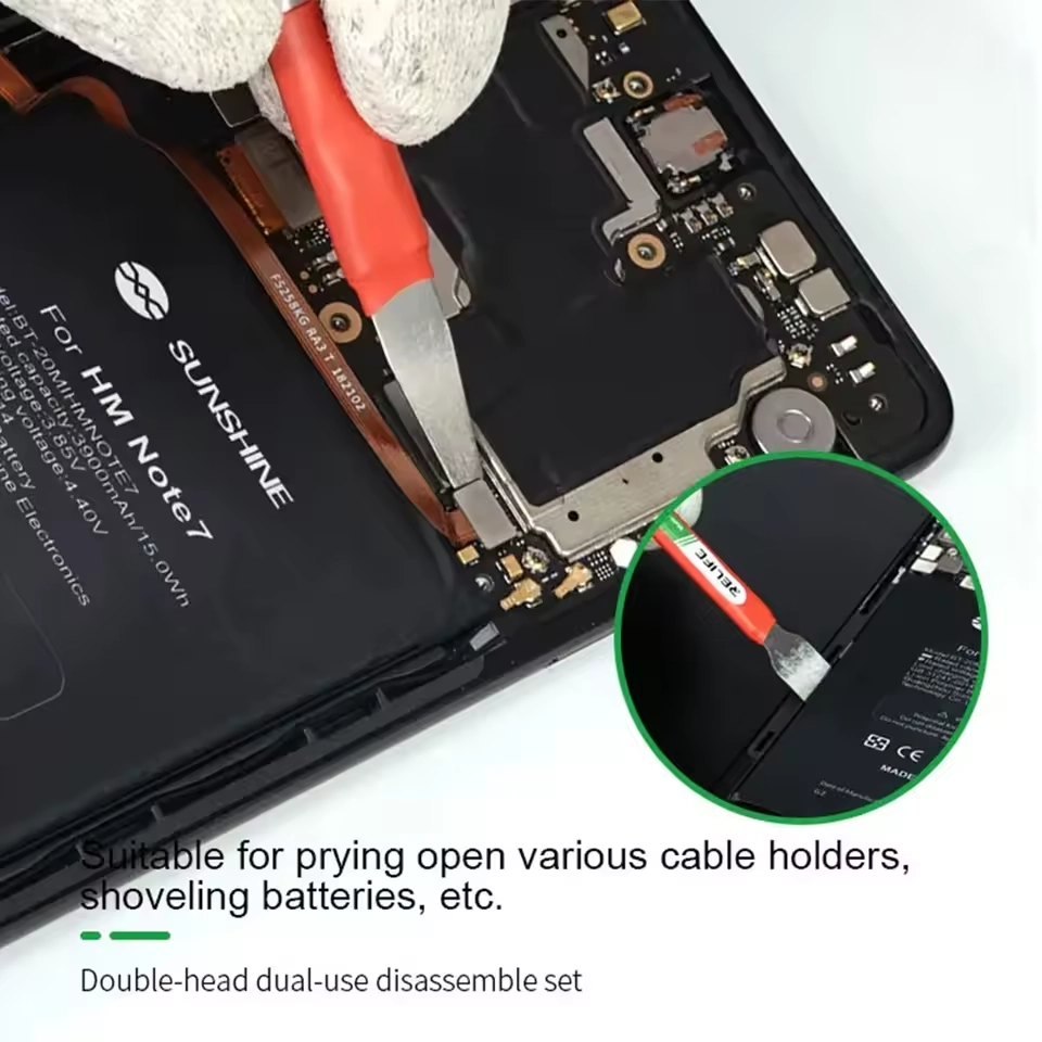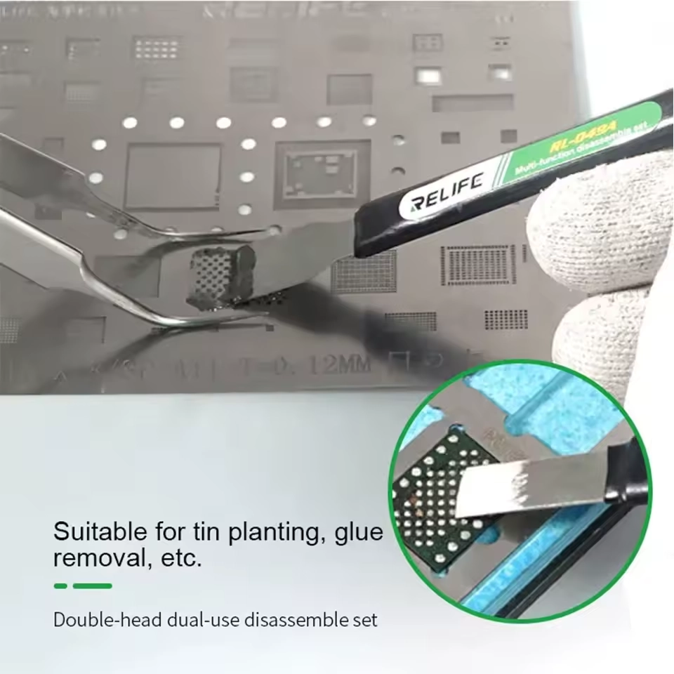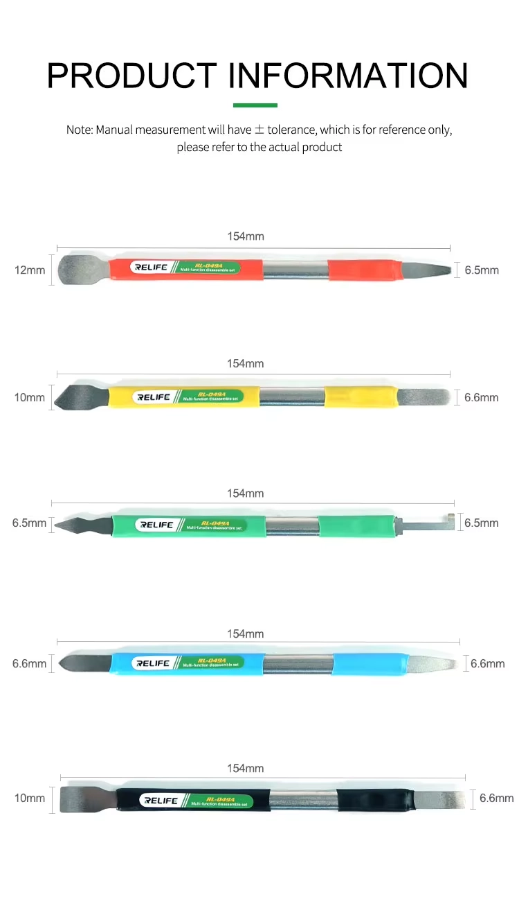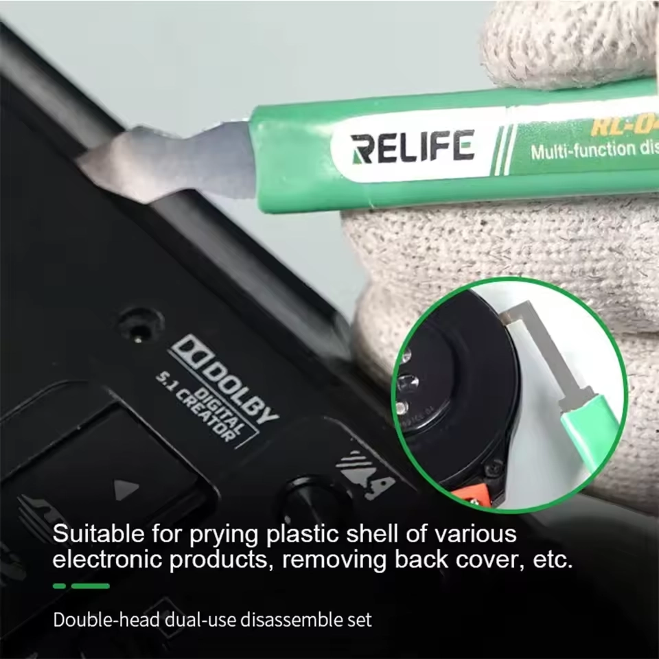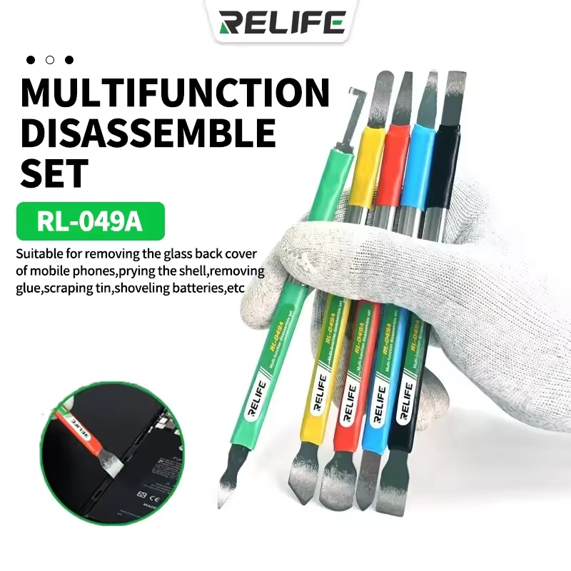 Il Relife RL-049A è il kit composto da 5 utensili a doppia testa (10 funzioni totali), offre la massima versatilità per ogni fase della riparazione, dalla rimozione delle back cover in vetro al "prying" delicato delle CPU. Acciaio ultra-sottile ad alta tenacità per entrare ovunque senza danneggiare i componenti.