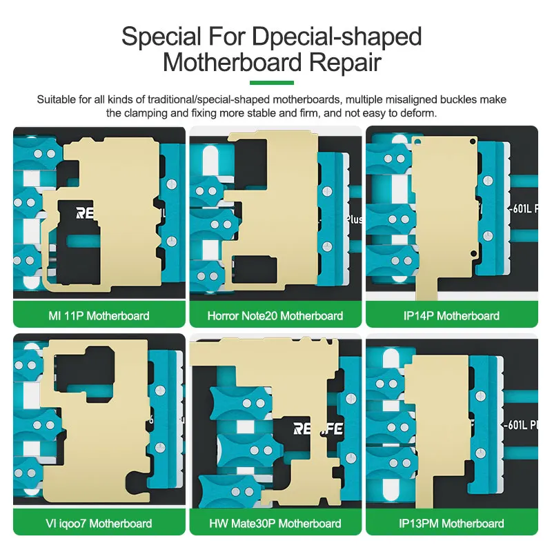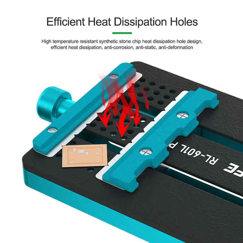 Il Relife RL-601L Plus è un supporto universale, progettato specificamente per soddisfare le esigenze dei centri di riparazione e dei tecnici specializzati. Grazie al suo innovativo design a doppio asse e alla struttura ultra-resistente, permette di bloccare saldamente schede madri e microchip, ottimizzando i tempi di lavoro durante le complesse operazioni di microsaldatura e rimozione della colla.