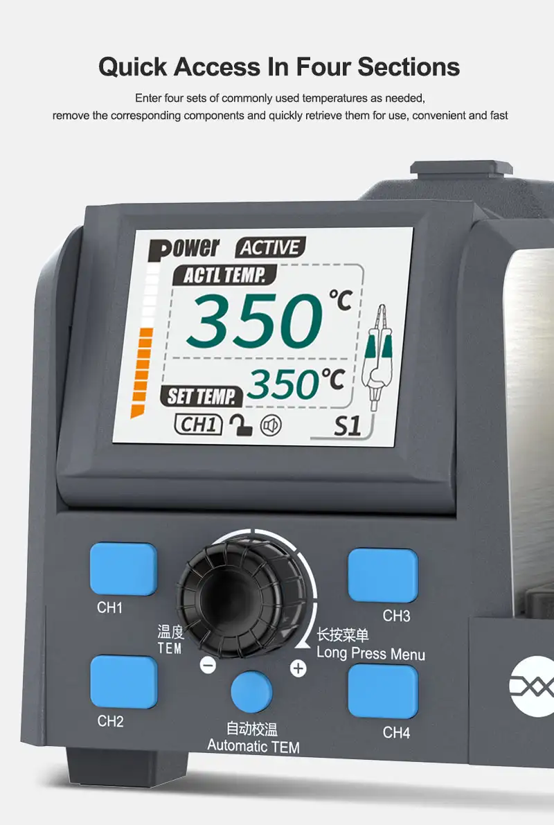 - Accesso Rapido a 4 Sezioni: Memorizza fino a 4 set di temperature utilizzate di frequente per richiamarle istantaneamente durante le diverse fasi della riparazione.