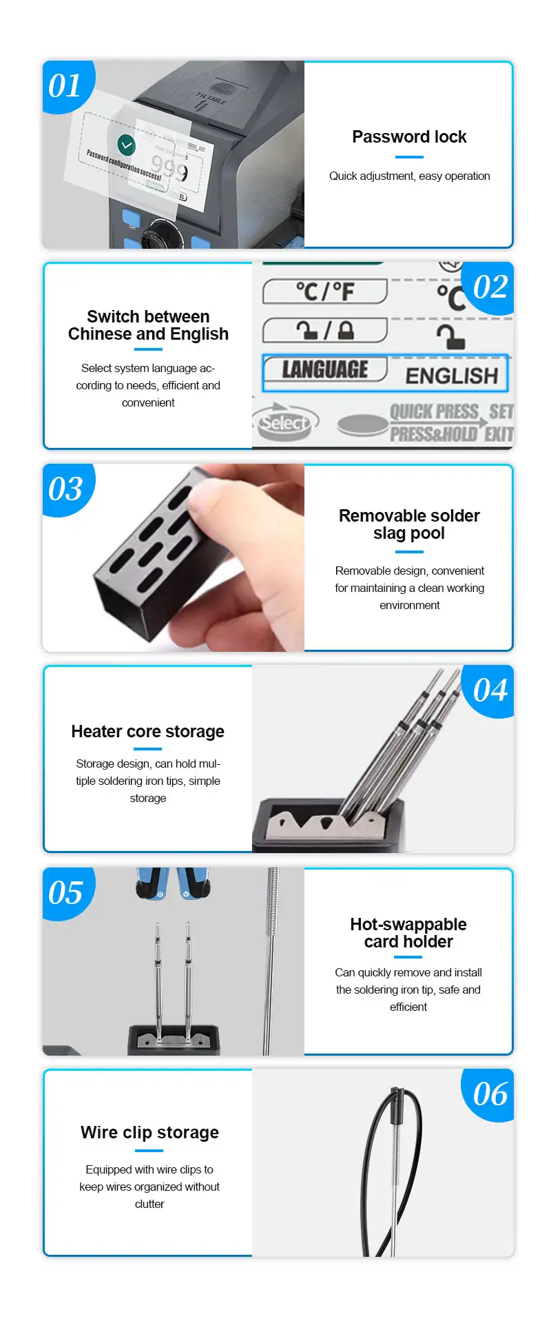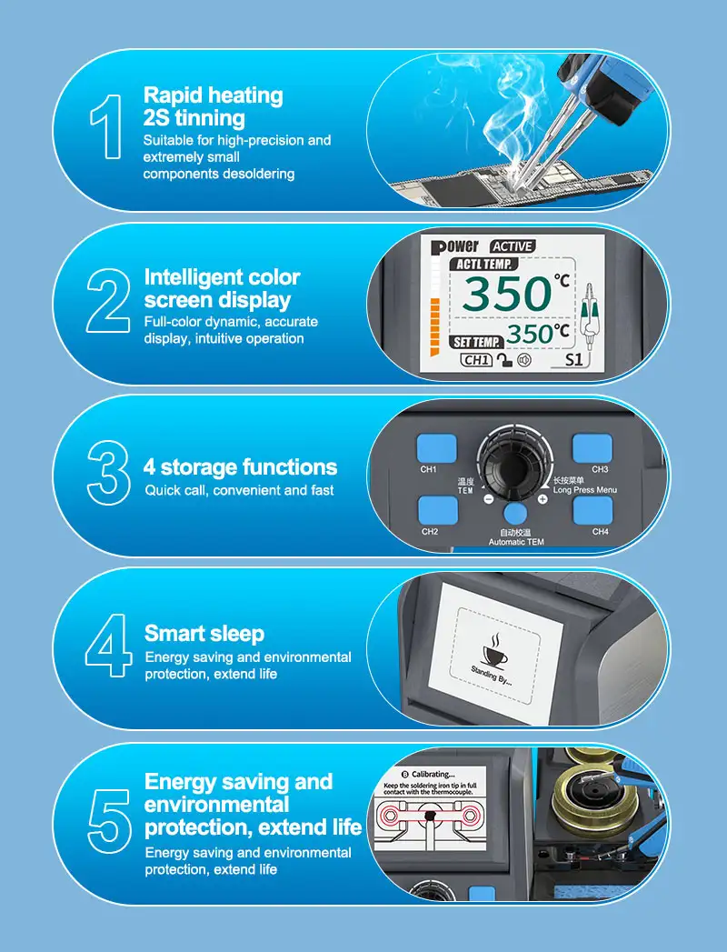 - Riscaldamento Rapido 2S: Raggiunge la temperatura di estagnatura in soli 2 secondi, ideale per lavori di alta precisione su componenti minuscoli.