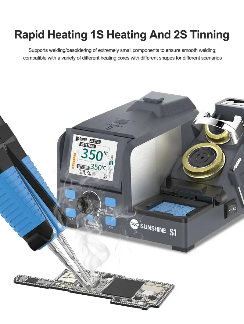 La Sunshine S1 è una stazione saldante intelligente progettata per la dissaldatura di componenti estremamente piccoli e ad alta precisione. Grazie al sistema di riscaldamento rapido che permette l'estagnatura in soli 2 secondi e a un'interfaccia utente dinamica, rappresenta lo strumento definitivo per l'efficienza nel laboratorio di riparazione.